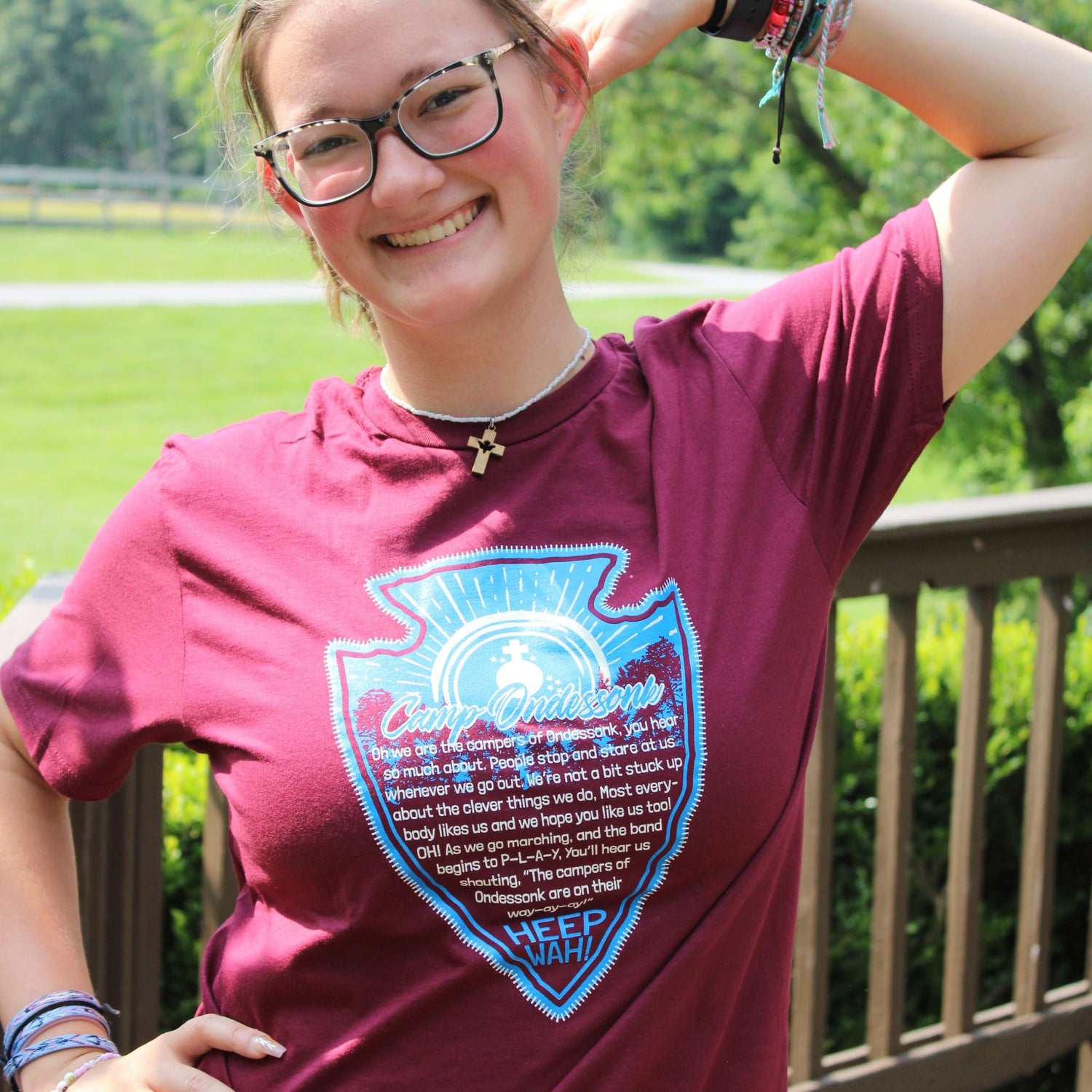 Show your Camp Ondessonk Spirit with this Marroon shirt showcasing Camp Ondessonks Camp Song.